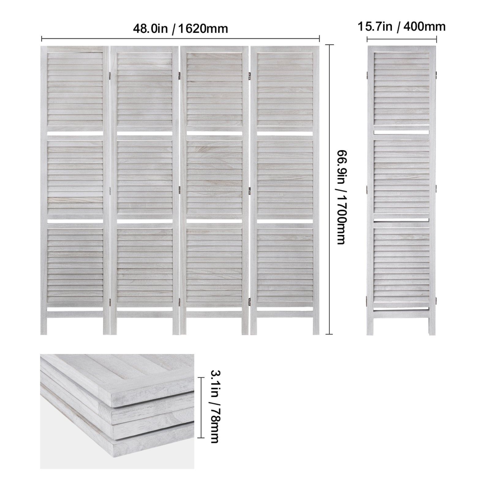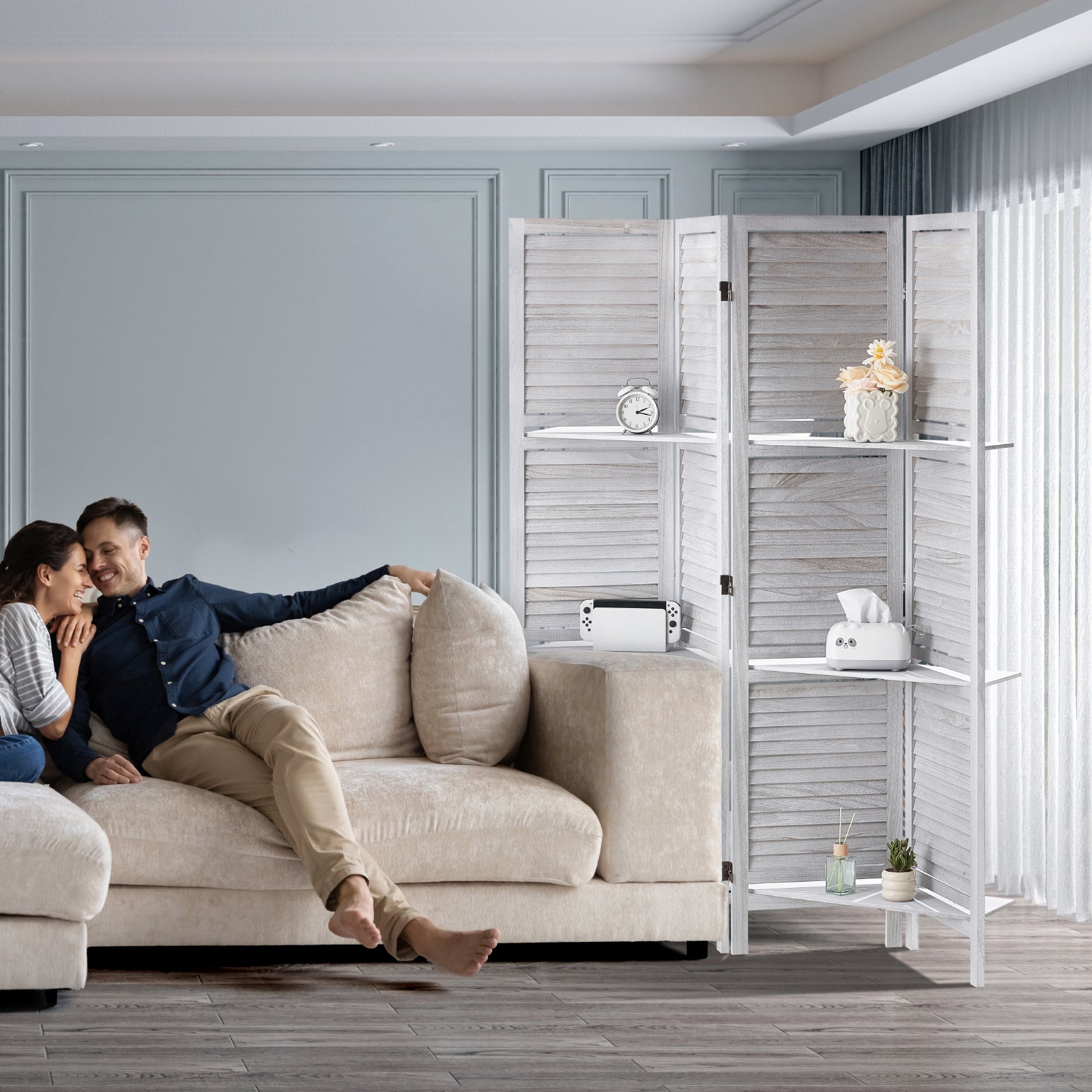 Paravent Avec Étagères En Bois Grisé À 4 Panneaux
