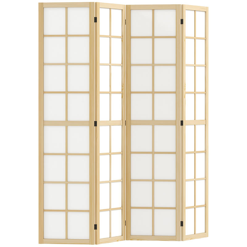 Paravent en Bois Clair à 4 Panneaux et Grille Blanche