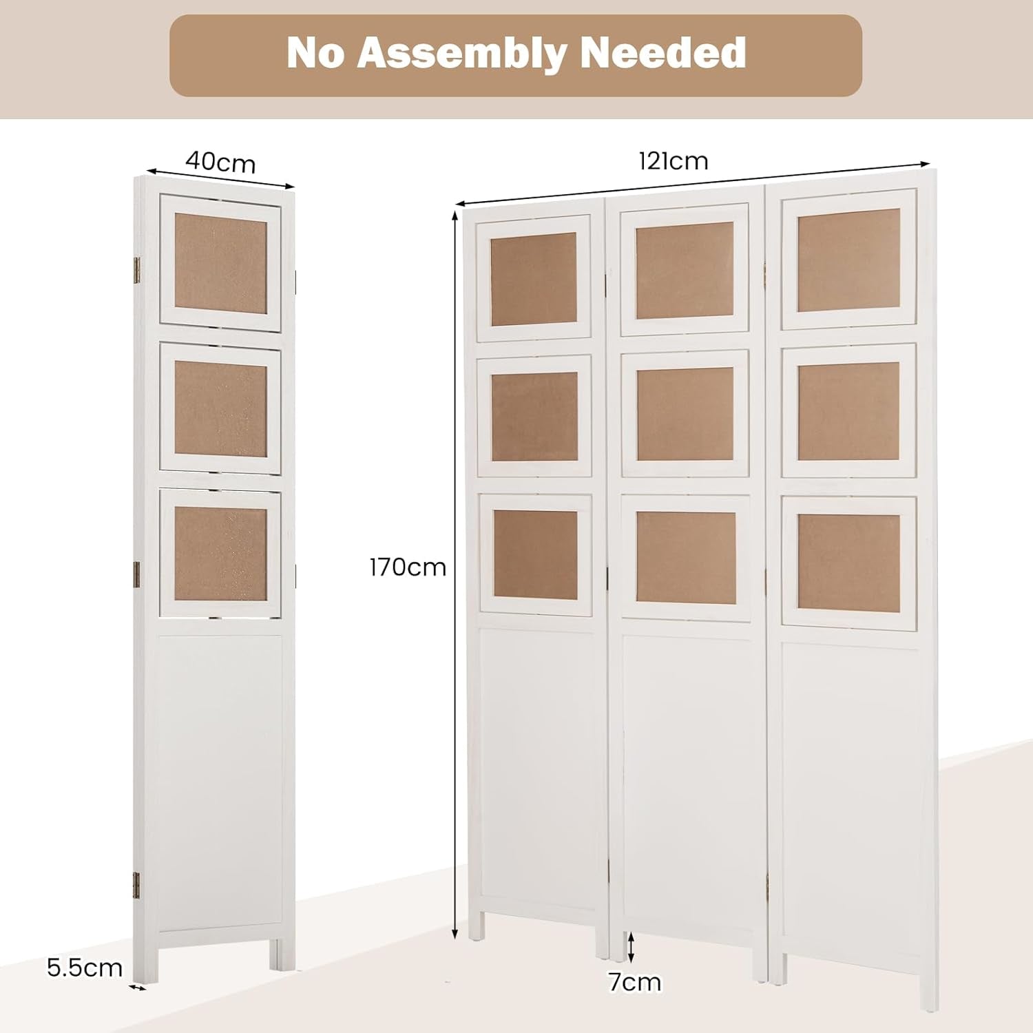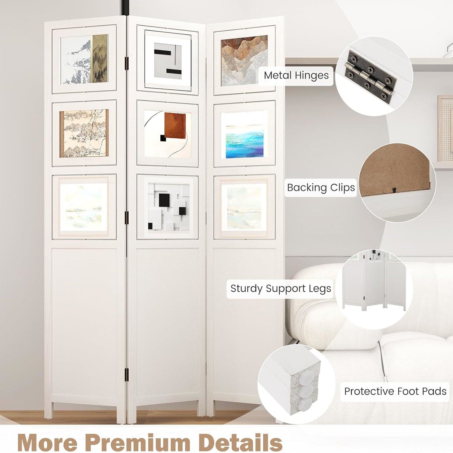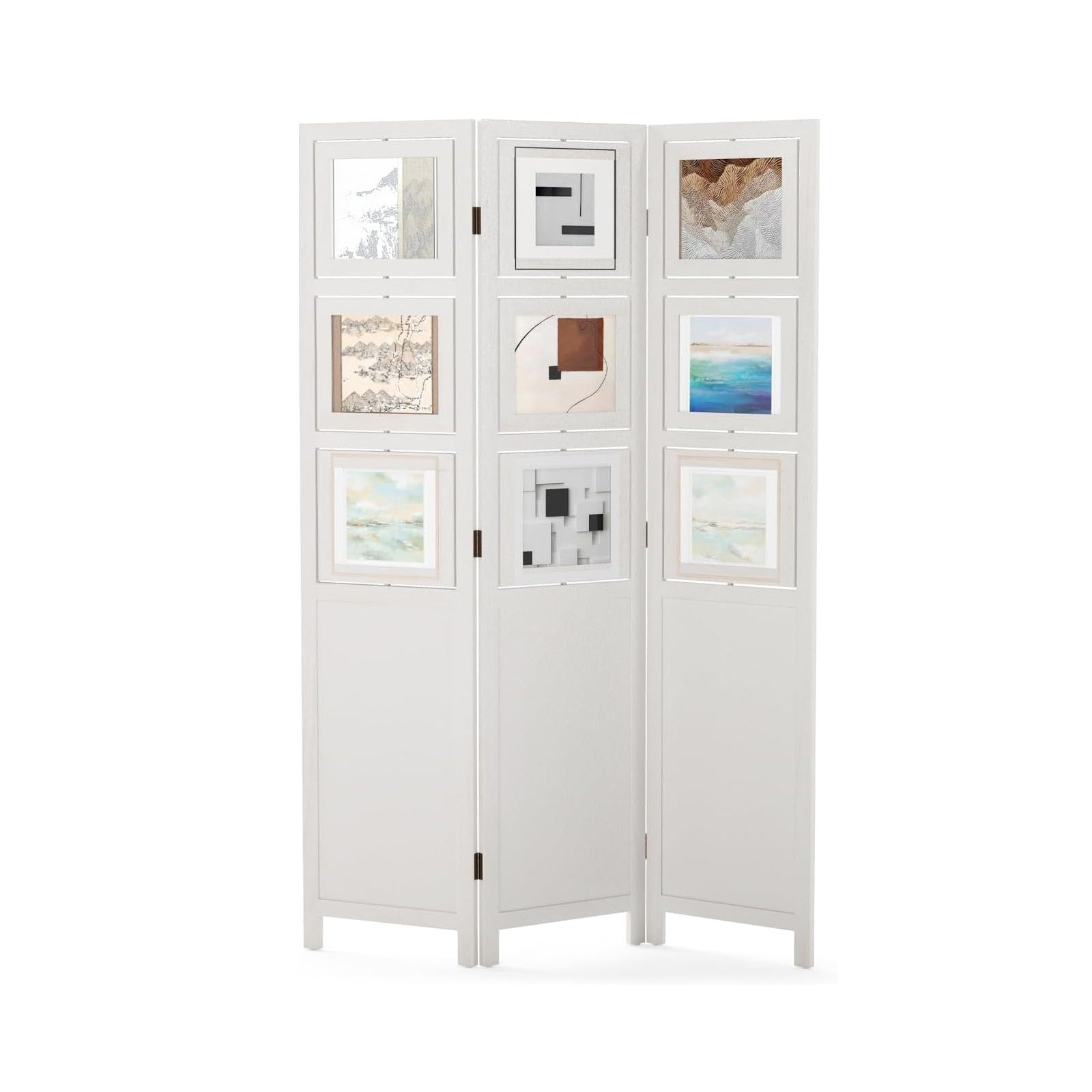 Ajoutez une touche moderne à votre intérieur avec ce paravent blanc. Ses trois panneaux sont dotés de neuf cadres pour exposer photos ou œuvres d'art. Créez une séparation élégante tout en personnalisant votre espace de vie.
