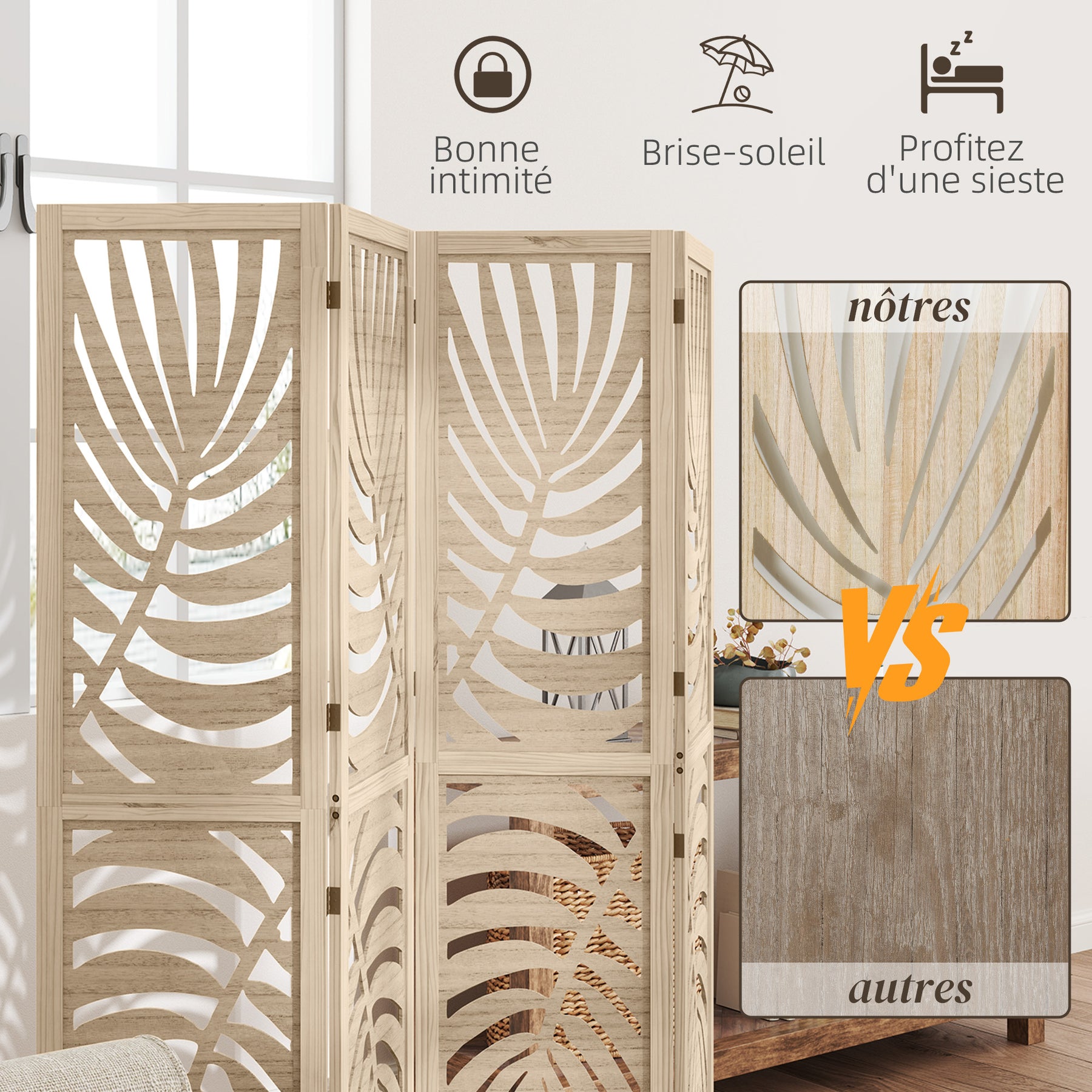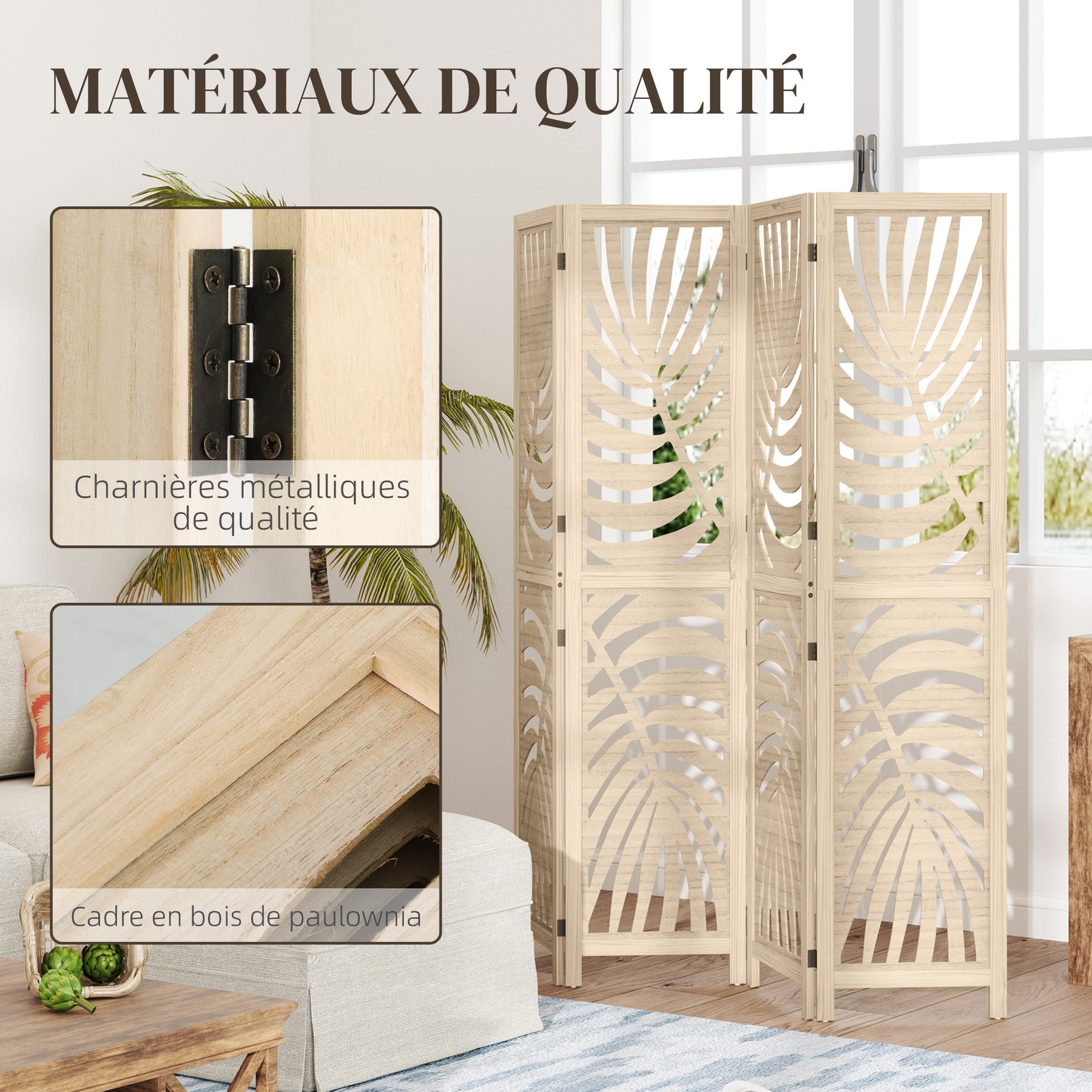 Apportez une touche d'exotisme à votre intérieur avec ce paravent en bois clair. Son design ajouré présente de magnifiques motifs de feuilles tropicales. Idéal pour diviser l'espace ou créer un coin intime. Sa structure à quatre panneaux s'adapte facilement à vos besoins.
