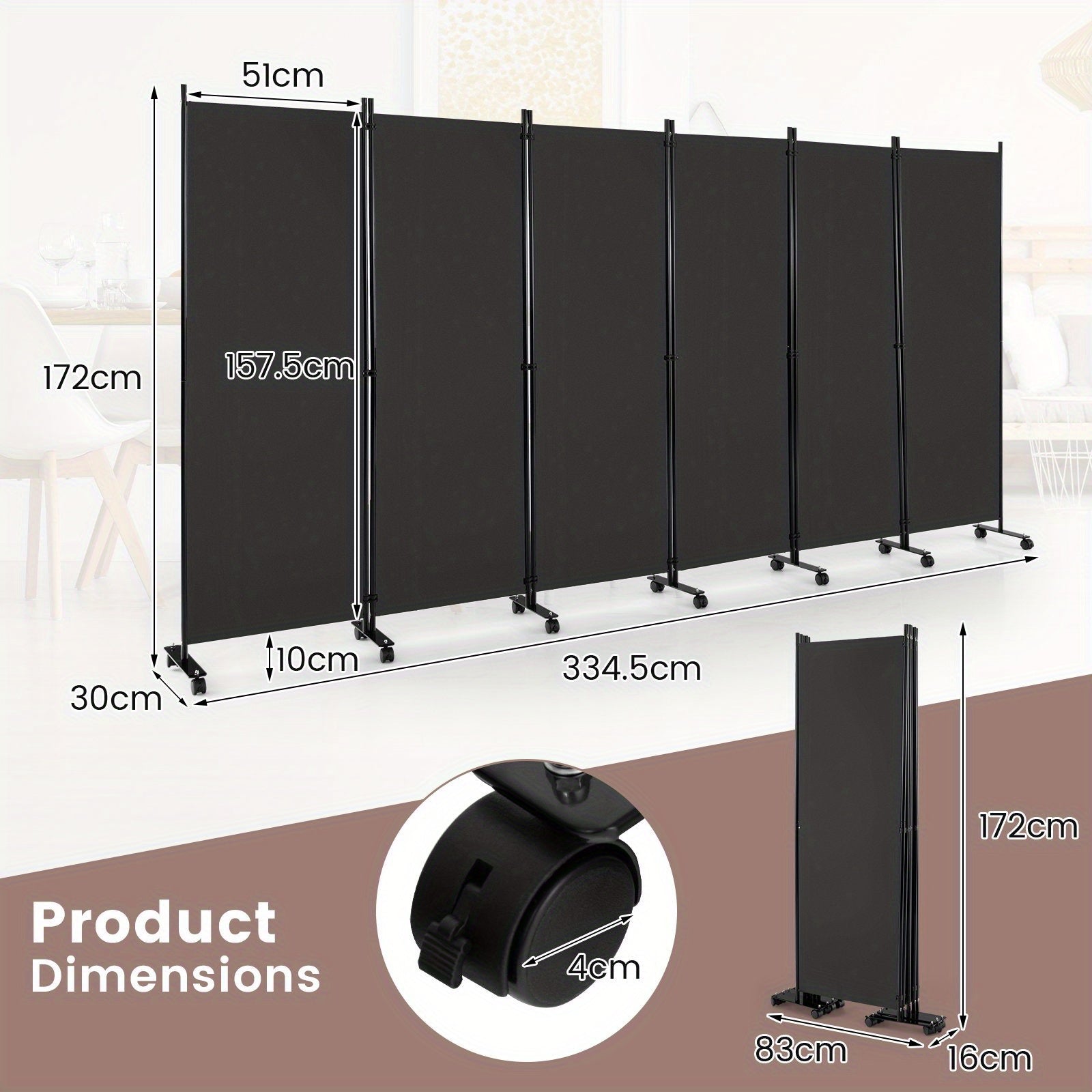 Divisez votre espace avec ce paravent mobile à 6 panneaux. Ses panneaux articulés en tissu noir sur cadre métallique offrent intimité et flexibilité. Facile à déplacer grâce à ses roulettes, il s'adapte à toutes vos envies de reconfiguration.